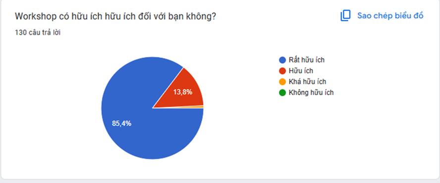Đặc biệt, Ban Tổ chức đã triển khai đánh giá mức độ hài lòng của người tham gia thông qua quét mã QR, lấy ý kiến phản hồi nhanh chóng, khách quan. Kết quả cho thấy 85,4% người tham gia đánh giá chương trình hữu ích và rất hài lòng, thể hiện rõ sự thành công và sức lan toả tích cực của buổi Workshop.