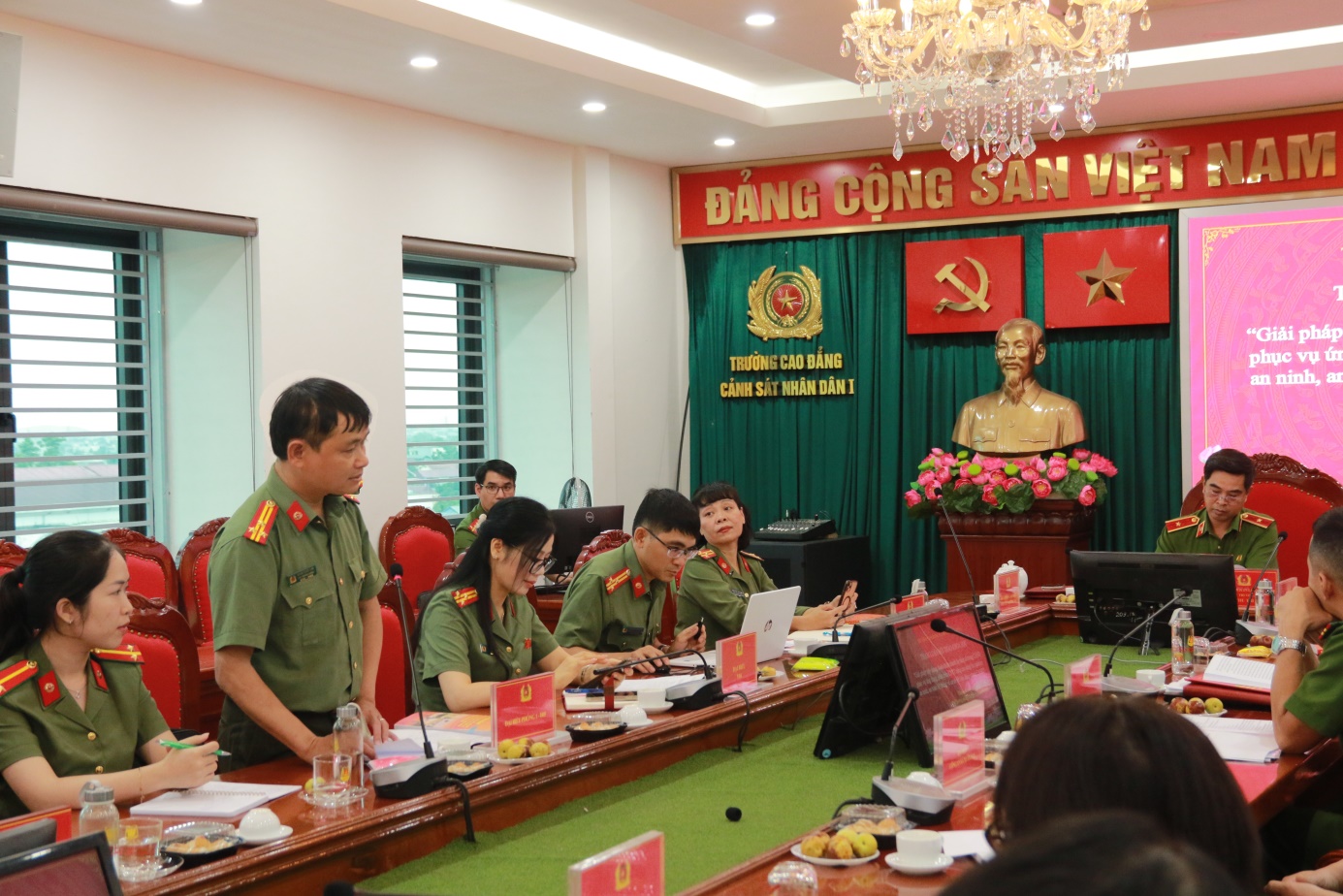Chủ trì Hội thảo đồng chí PGS.TS, Thiếu tướng Lê Hoài Nam, Hiệu trưởng. Tham dự Hội thảo có đồng chí TS, Đại tá Đồng Thị Hồng Nhung, Phó Hiệu trưởng; đồng chí Đại tá Trần Cao Kiều, Phó Cục trưởng Cục Truyền thông CAND; đại diện lãnh đạo phòng Cục Pháp chế và cải cách hành chính, tư pháp; Cục Khoa học, chiến lược và lịch sử công an; Cục Công nghệ thông tin; Công an tỉnh Ninh Bình; Công an tỉnh Phú Thọ; đại diện chỉ huy Đội, cán bộ Công an tỉnh Hưng Yên, Công an phường Hà Đông, Công an xã Xuân Mai; lãnh đạo các Phòng, Khoa; lãnh đạo, cán bộ Phòng Bảo đảm chất lượng đào tạo và các tác giả có bài viết trong kỷ yếu Hội thảo.