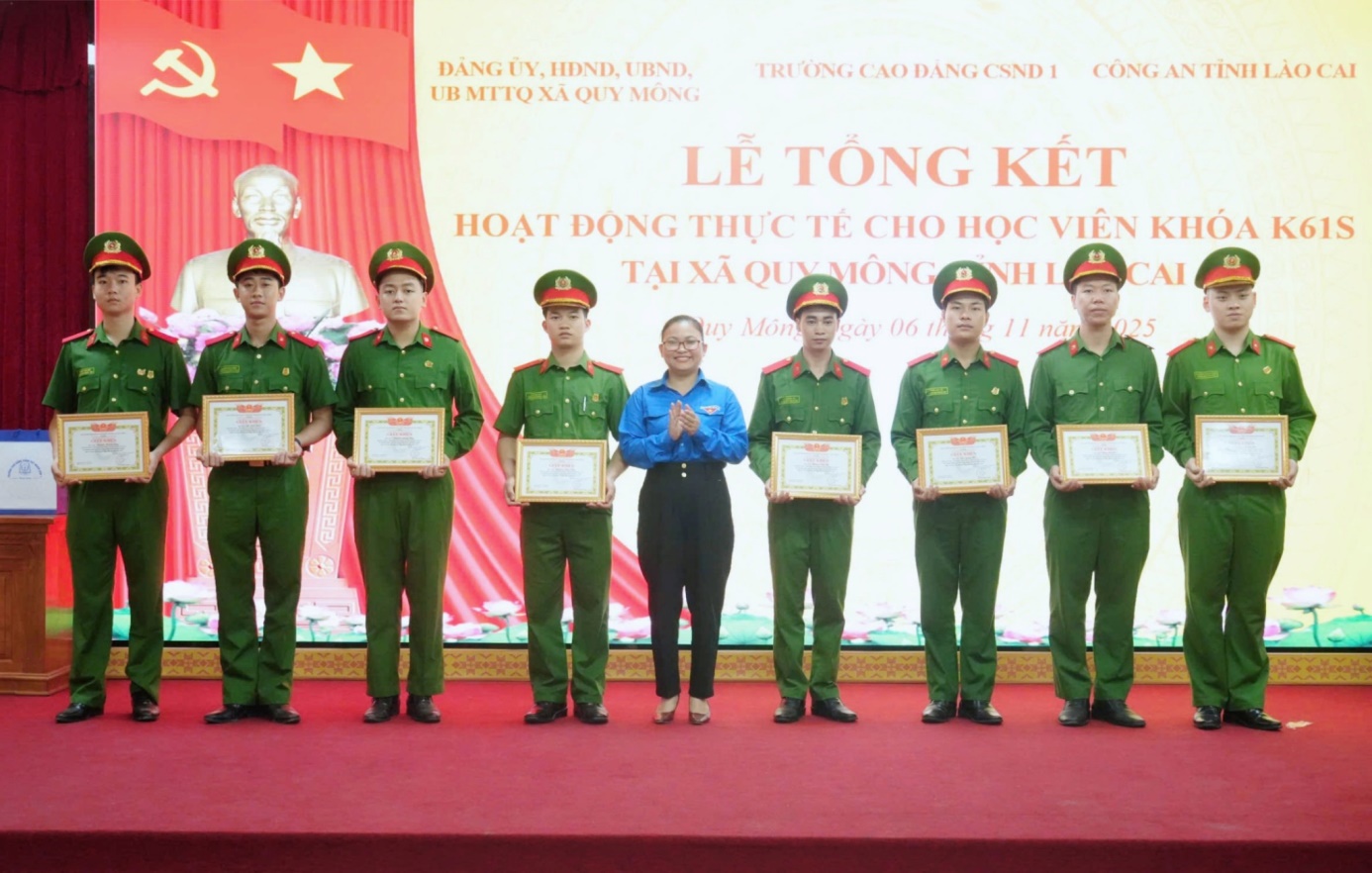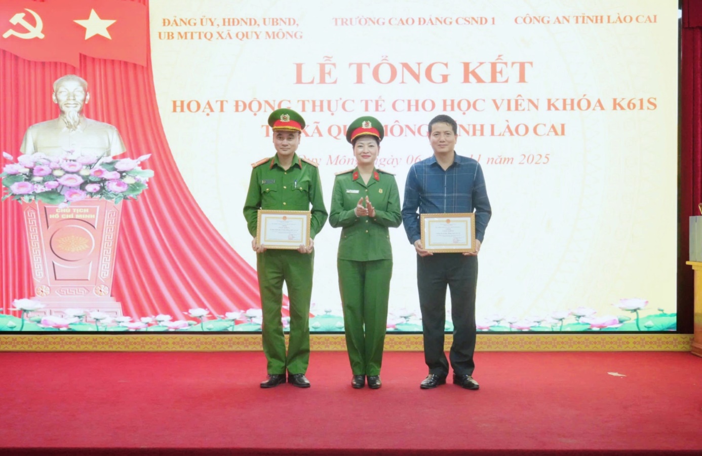 Chủ trì Lễ Tổng kết đồng chí TS, Đại tá Đồng Thị Hồng Nhung, Phó Hiệu trưởng, Phó Trưởng ban Chỉ đạo. Cùng tham dự buổi Lễ có các đồng chí đại diện Ban Giám đốc và một số phòng của Công an tỉnh Lào Cai; các đồng chí trong Đảng ủy, HĐND, UBND xã Quy Mông; các đồng chí trong Ban Chỉ đạo hoạt động thực tế; các chủ nhiệm trung đội, giáo viên hướng dẫn cùng học viên thực tế đợt 1 Khóa K61S.