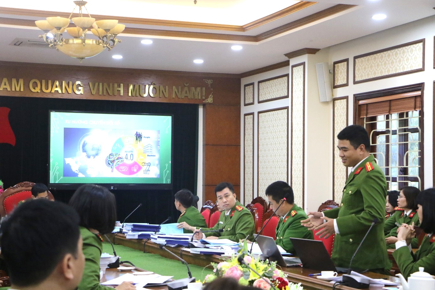 Đồng chí Thiếu tá Vũ Xuân Thắng – Khoa Luật trình bày sáng kiến của nhóm tại buổi nghiệm thu