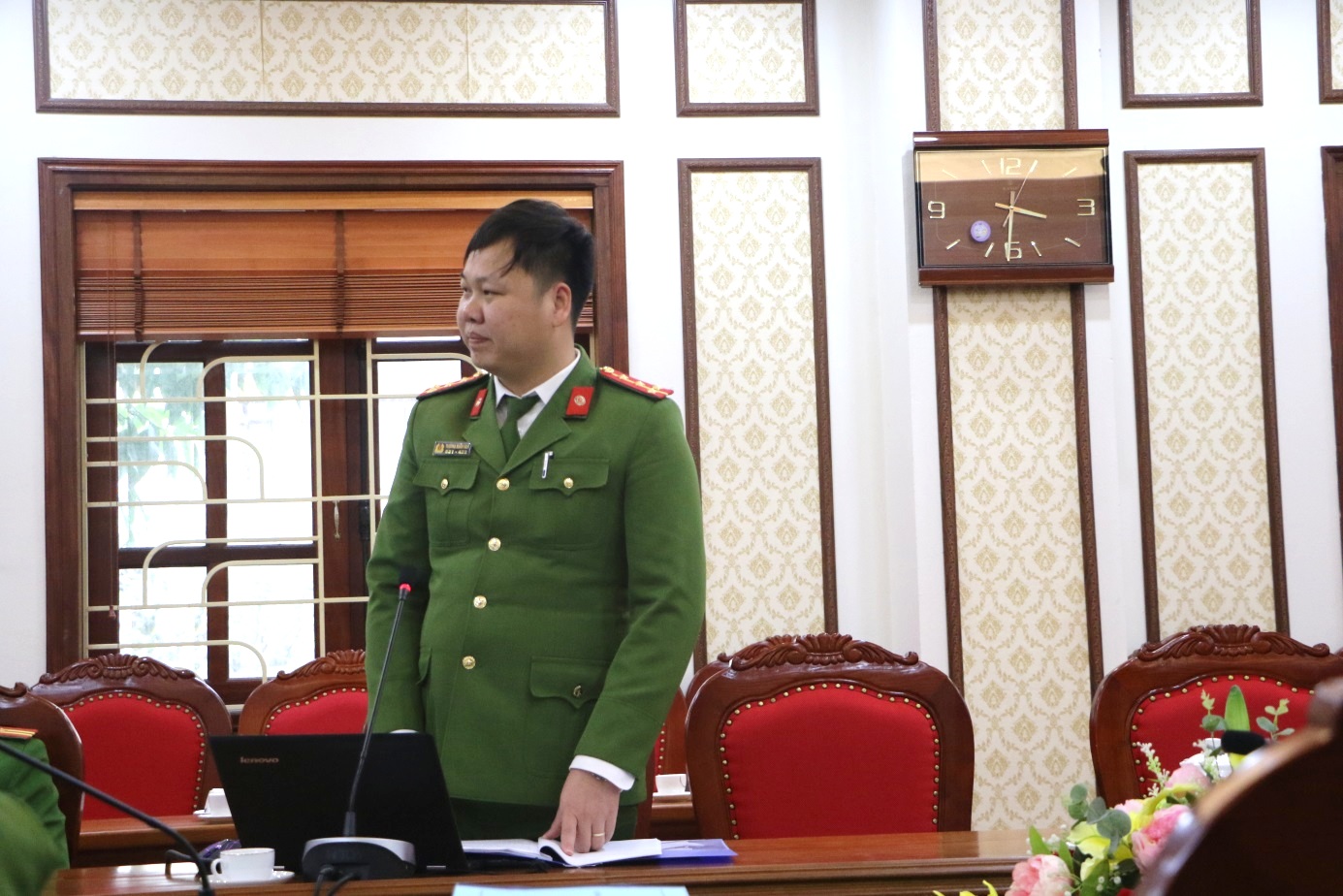 Đồng chí Đại úy Trương Xuân Hòa – Khoa Nghiệp vụ cơ bản trình bày phần việc tại buổi nghiệm thu