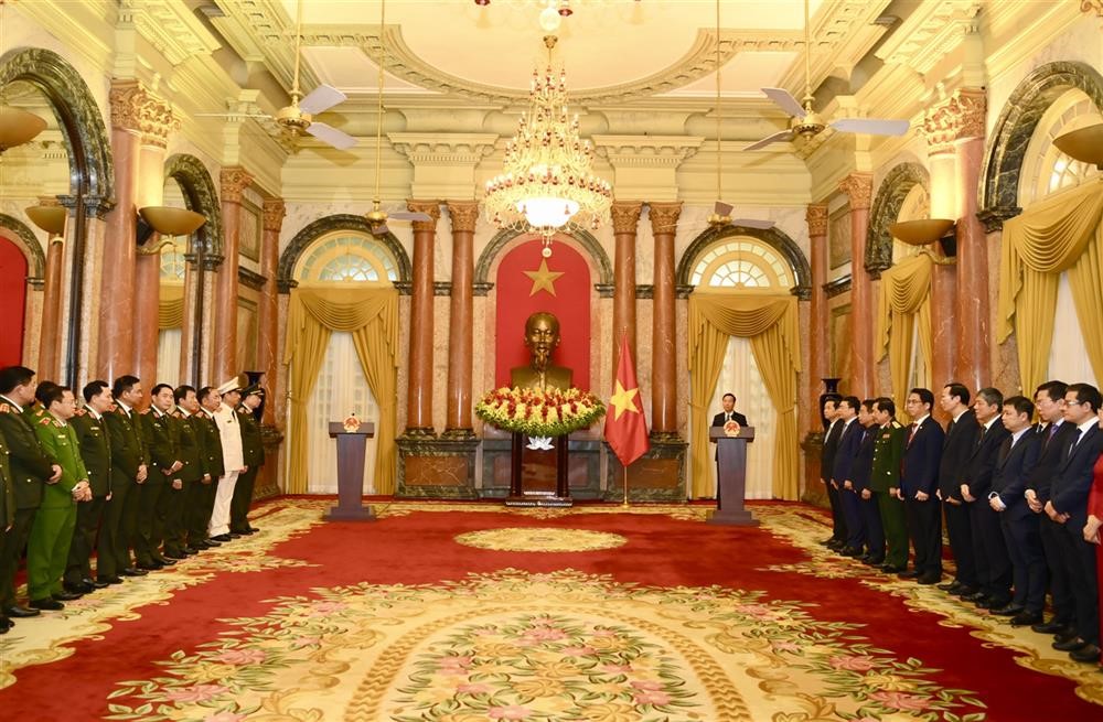 Chủ tịch nước Võ Văn Thưởng và các đồng chí lãnh đạo Bộ Công an chúc mừng Thứ trưởng Nguyễn Duy Ngọc.