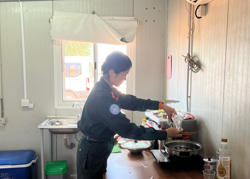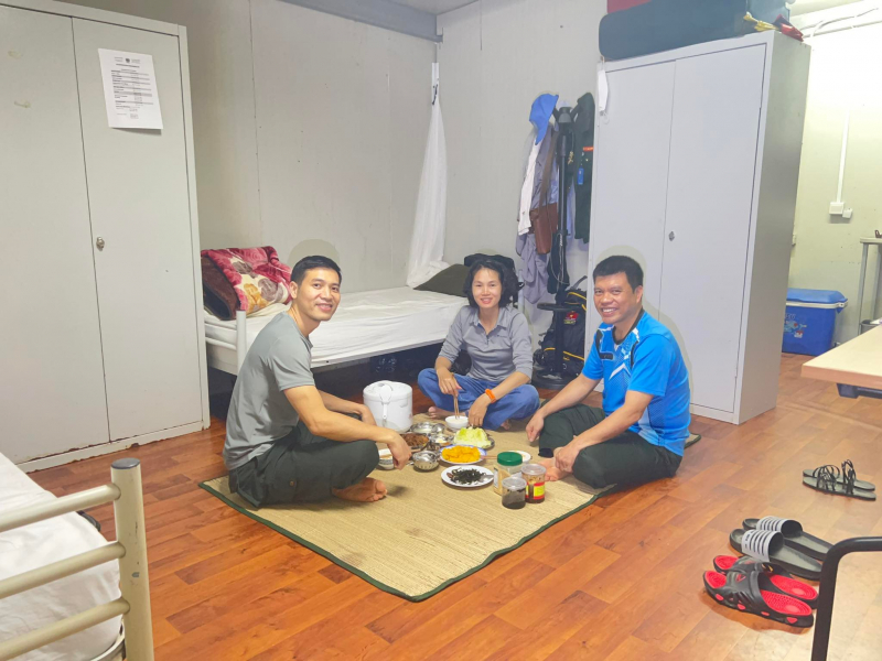 Tại căn cứ Tomping, cả 3 cán bộ Công an Việt Nam thường có những bữa ăn cùng nhau. Trung tá Vinh cho biết, chị là người chịu trách nhiệm nấu ăn trong khi Đại tá Lê Quốc Huy cùng Trung tá Vũ Việt Hùng sẽ phụ trách các công việc chuẩn bị khác. Trong đó bữa trưa được Trung tá Vinh gọi đùa là bữa ăn kiểu dã chiến vì chỉ có hơn 1 giờ đồng hồ để đi bộ về phòng, nấu nướng và dùng bữa.