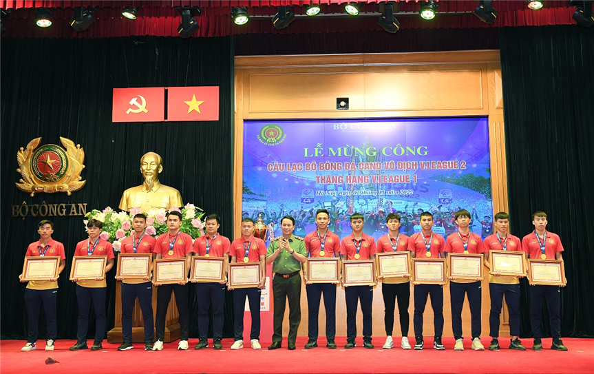 Thứ trưởng Lê Quốc Hùng trao Bằng khen của Bộ Công an tặng các cầu thủ bóng đá có thành tích xuất sắc trong thi đấu.