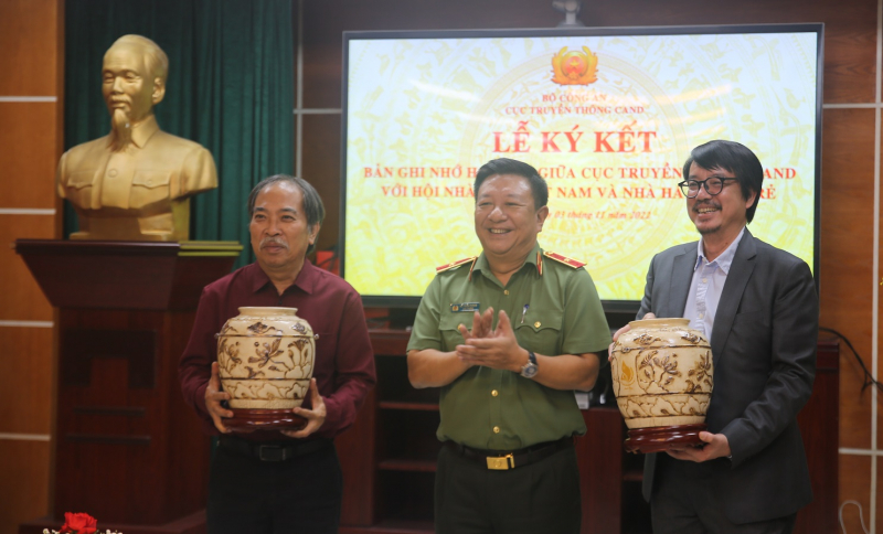 Đồng chí Cục trưởng Cục Truyền thông CAND tặng bình gốm cho lãnh đạo Hội Nhà văn Việt Nam, Nhà hát Tuổi trẻ.